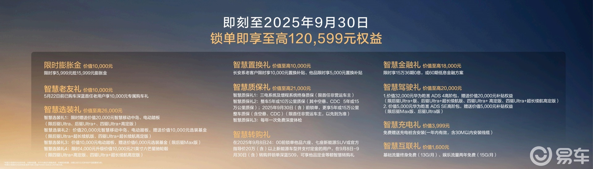 新问界M7依托华为生态收获关注,但深蓝S09以“空间更大、配置更满、价格更优”的全维优势,成为30万级家庭SUV的“价值标杆”。无论是周末全家自驾的从容,还是日常通勤的智能便捷,深蓝S09都将“技术优势”转化为用户可感知的“幸福体验”,是“同技术阵营下的更优解”。前不久深蓝S09上市还有至高价值120599元的权益,进一步给消费者来了实惠的选择,大家可以自行了解。还有一点可以看出深蓝S09的贴心之处,如果预算低一点的朋友可以看看焕新升级后的深蓝S09后驱MAX版本,增加了后排娱乐屏、前排座椅通风/加热/按摩等配置,配上内饰质感的全新进阶,加量不加价,且经过各种权益和补贴后有望20.49万元拿下,也是一个性价比不错的选择。