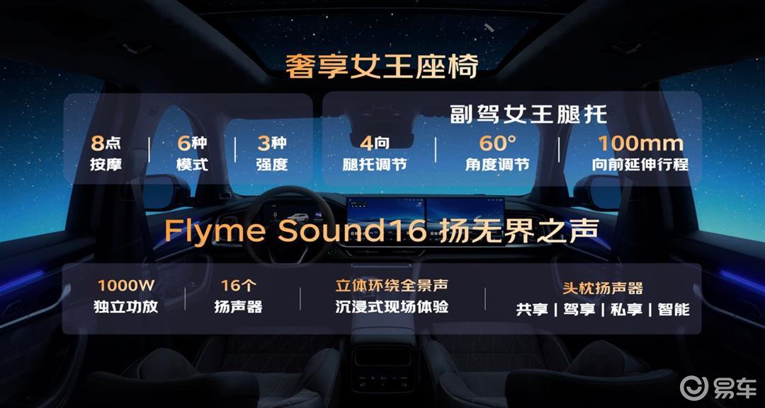 配置方面,新车提供前排座椅加热 / 通风 / 按摩、方向盘加热、以及后排座椅 30-40 度电动调节;车内环境氛围灯以及 Flyme Sound 无界之声 16 扬音响系统等均为全系标配。焕新升级的“奢享女王副驾”,拥有8点座椅按摩,6种模式,3种强度,以及新增4项腿托功能,只需轻触调节,腿托即可向前延伸达100毫米,并支持高达60度的多角度自由调节。