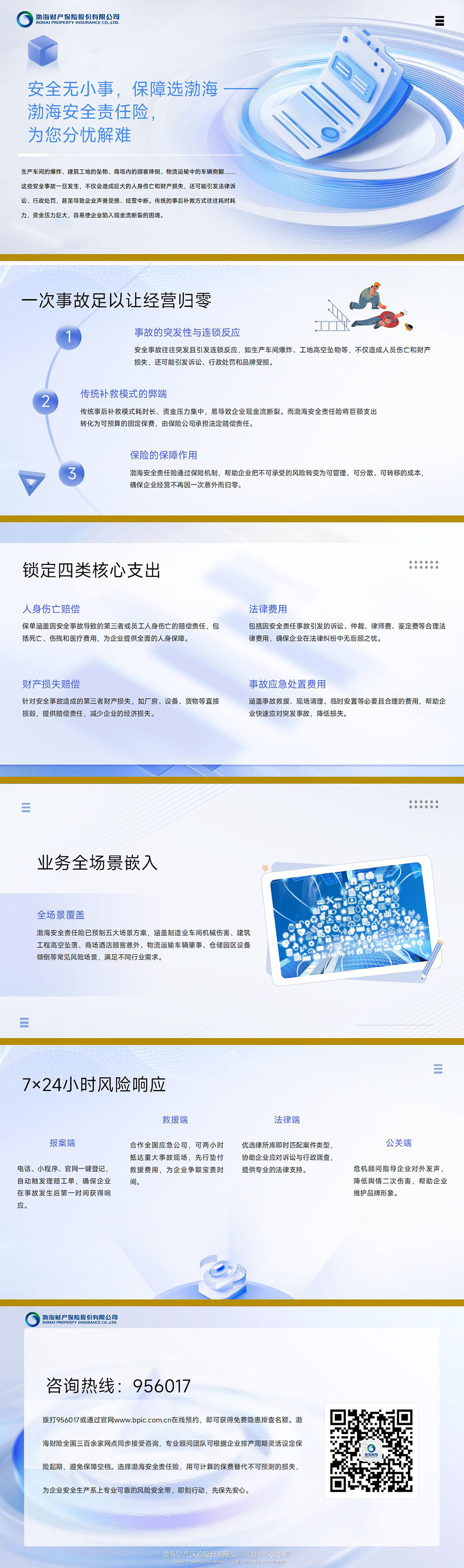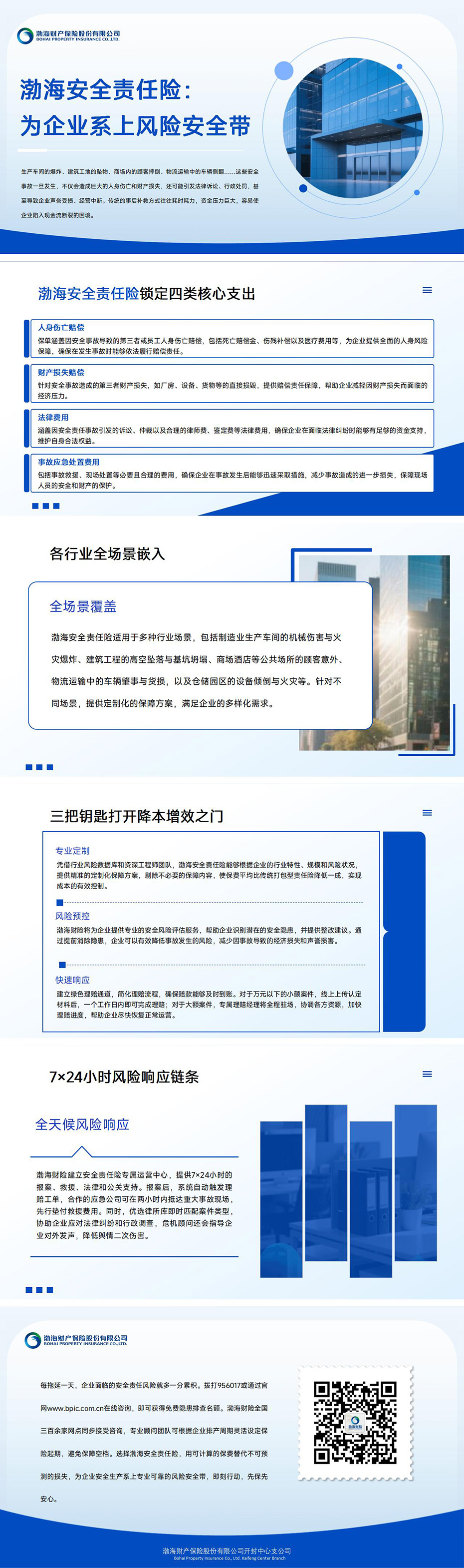 在企业生产经营的每一个角落,安全风险如隐形的浪涛,时刻威胁着企业的发展根基。生产车间的爆炸、建筑工地的坠物、商场内的顾客摔倒…… 每一次安全事故的发生,都可能引发巨额赔偿、法律诉讼甚至企业经营中断的连锁反应。渤海安全责任险,如同一条坚固的风险安全带,为企业在各类安全风险中筑牢防护屏障。