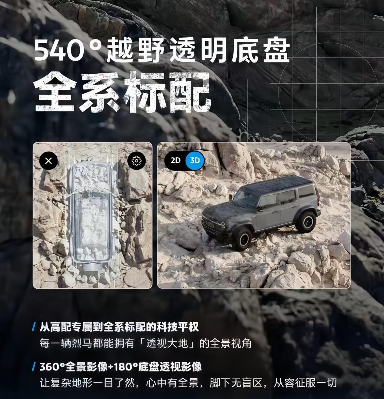 新车最主要的变化是将540°越野透明底盘系统设为全系标配。该系统由360°全景影像与180°底盘透视功能组合而成,当车辆切换至低速四驱或沙地、泥泞等越野模式时可自动开启全景视窗。系统依托新一代高清摄像头(像素提升30%)与福特自研算法,即便在连续颠簸路段,全景画面也能保持流畅稳定。