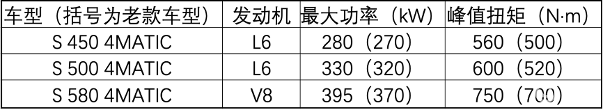新款车型在动力上也有明显的提升,甚至采用了全新结构的发动机。不论是入门的S450还是V8发动机的S580都有明显的提升,具体的参数和升级幅度我用一张图给大家展示出来了。