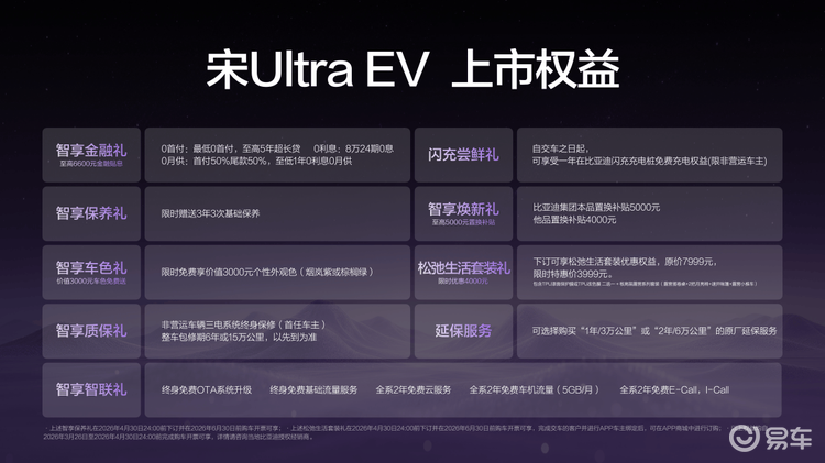 比亚迪王朝正在构建一个从购车、用车、到养车的全链路无忧体系。为此,宋Ultra EV带来了“0元购、0元用、0元养”的超重磅购车权益!同时还有其他丰富权益,为用户带来超值购车体验。