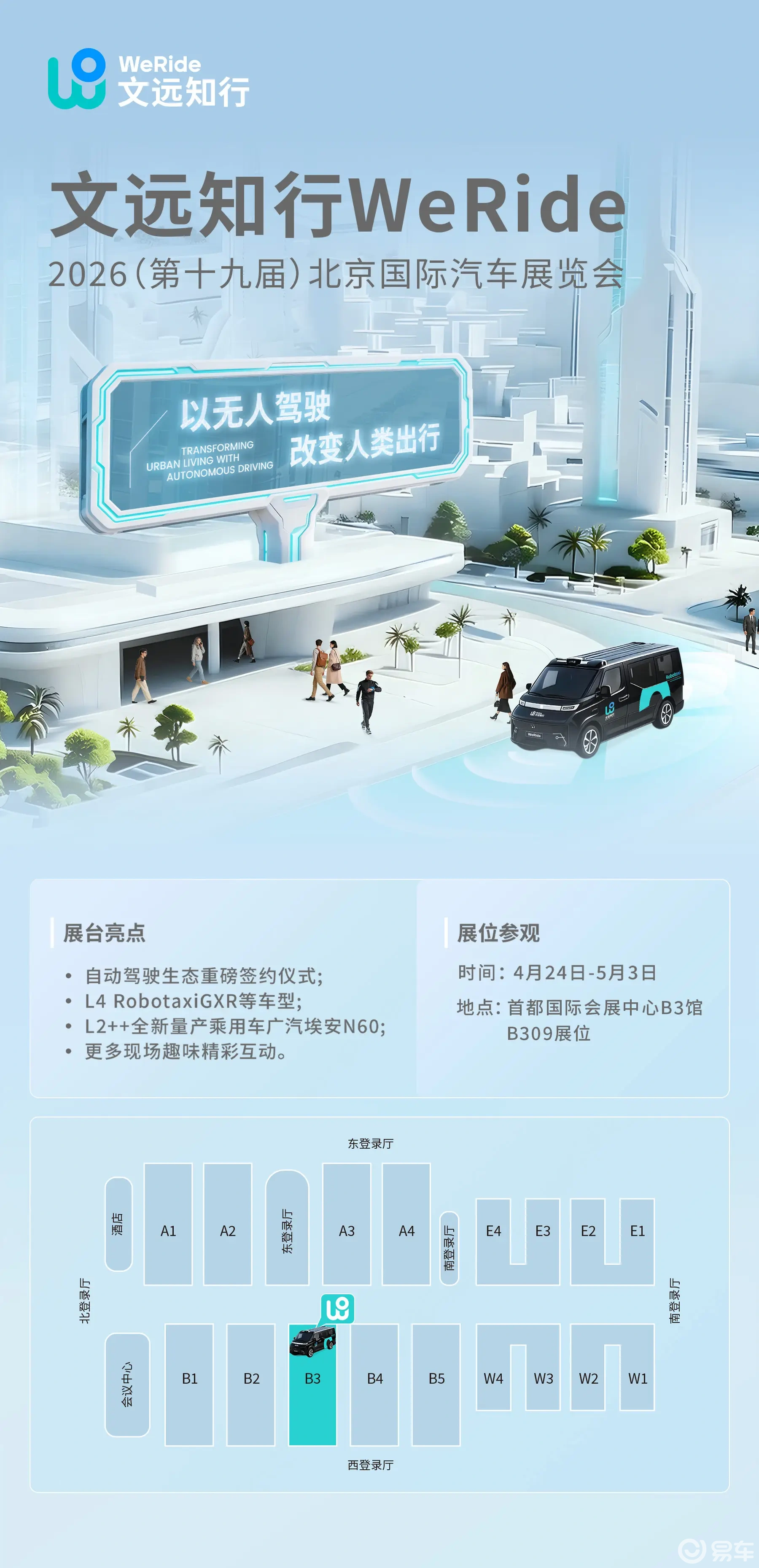 4月24日-5月3日,2026(第十九届)北京国际汽车展览会将在首都国际会展中心、中国国际展览中心(顺义馆)举行。届时,国内外头部车企将齐聚一堂,各种新技术、新产品竞相亮相,电车通(ID:dianchetong233)报道团也将亲赴现场,为大家带来一线、专业、立体的深度报道。