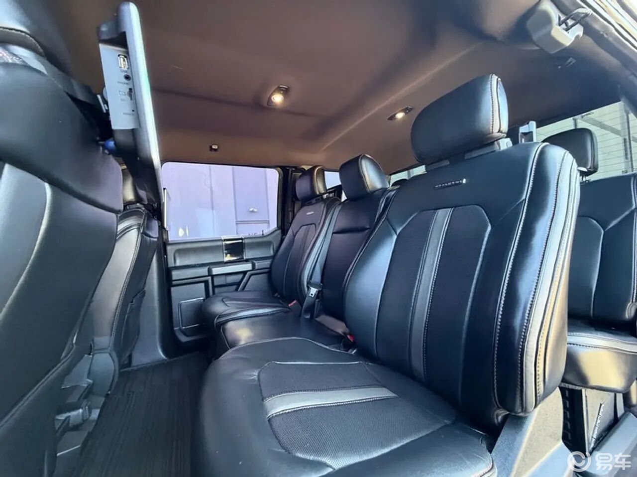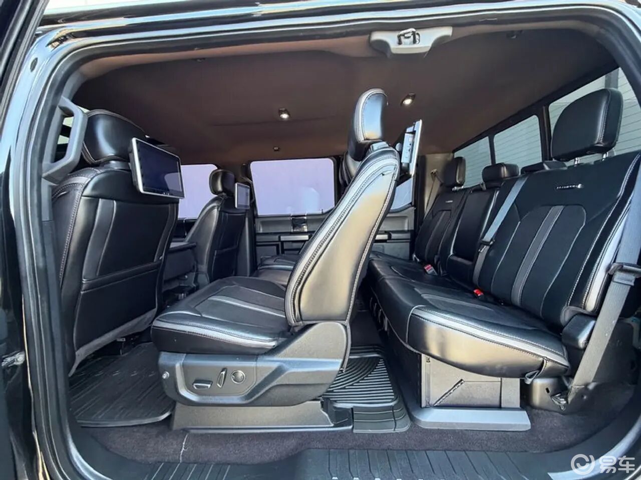 内饰保留了白金版原厂豪华配置,同时升级了更大尺寸中控触控屏,并在座椅靠背加装额外显示屏,第二排为电动调节座椅,后部还增设独立空调与加热系统,让这台巨型皮卡的乘坐体验更接近豪华 MPV。