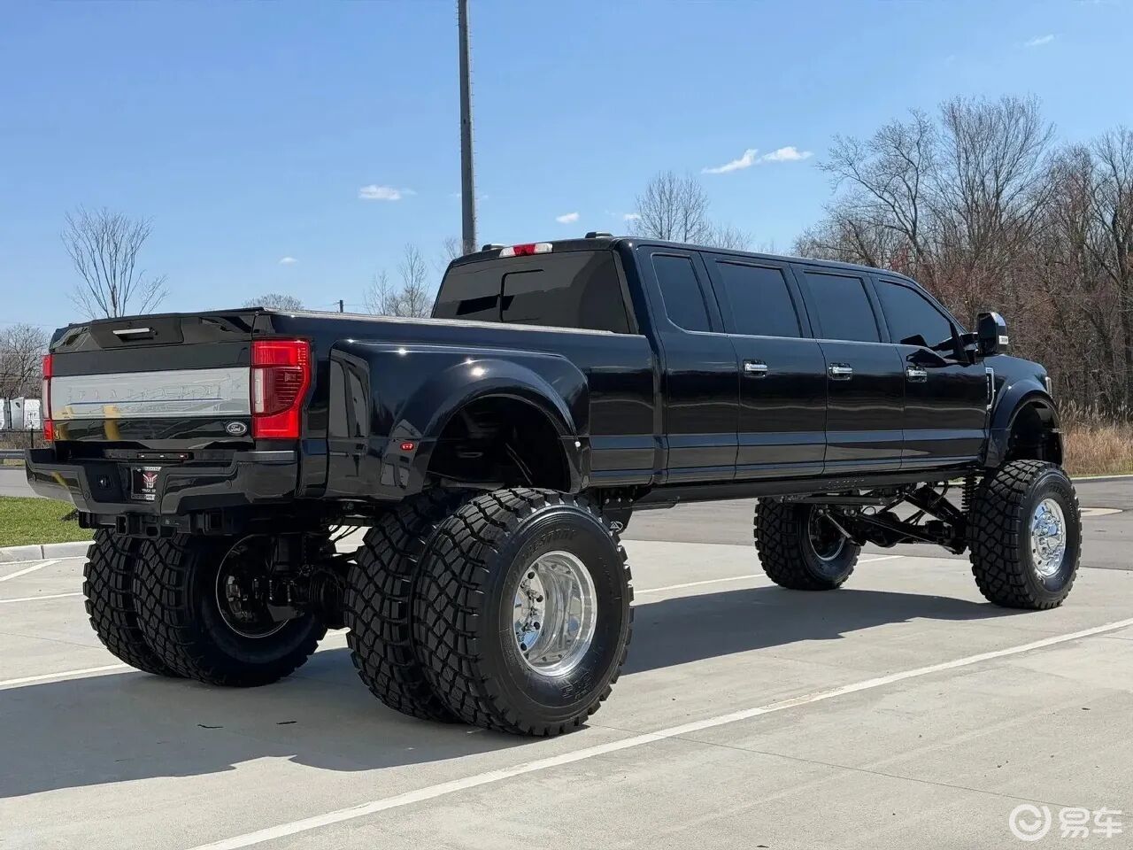 这台猛兽的原型本是 2020 款 Ford F-450 Platinum,原厂尺寸已然堪称巨无霸,可改装商 Stretch My Truck 显然不满足于此,对车架与车身进行了彻底加长,额外增加了一组车门与第三排座椅,最终打造出可容纳 11 名乘客的超大座舱,搭配 8 英尺货斗,车身体量直逼重型半挂。
