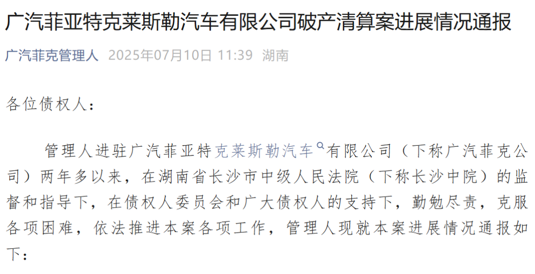 7月8日,广汽菲克管理人发布消息称,因广汽菲克公司已无重整可能,根据部分债权人意见,经债权人委员会讨论,管理人已经申请长沙中院裁定宣告广汽菲克公司破产。