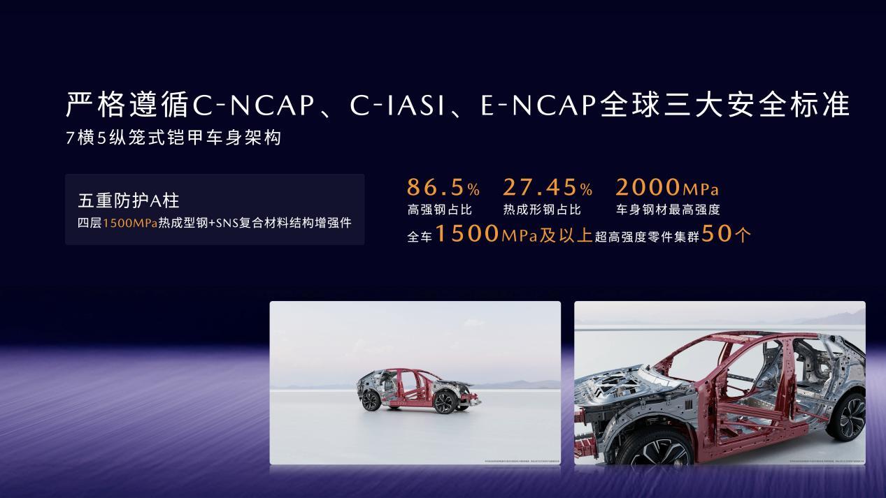 卓越的碰撞成绩来自于车身结构的创新。EZ-60采用7横5纵的笼式铠甲结构,高强钢占比86.5%,热成形钢27.45%,最高强度2000MPa,全车1500MPa及以上超高强度零件集群50个,关键部位更是层层加码,如A柱采用五重防护结构,内外双层1500MPa热成型钢和腔体SNS复合材料,大幅增强A柱的钣金强度和刚度,抗弯性能提升44%。