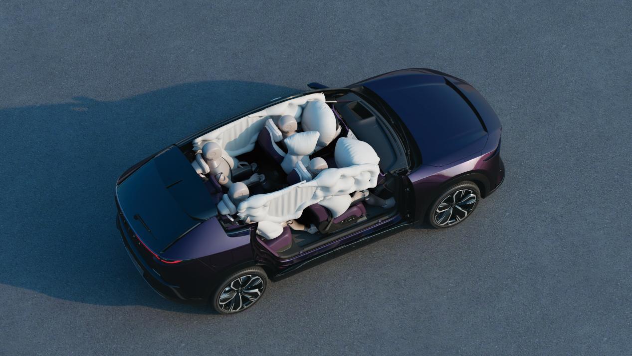 EZ-60全系标配9个安全气囊,总容积370L,保护面积26500cm²,双腔中央气囊能防止前排乘员在侧面撞击中发生二次伤害,2米超长侧气帘从A柱覆盖到C柱,副驾采用代表行业最高水平的飞跃式气囊,能够在爆炸的瞬间避开大屏。电池系统采用8层防护架构,提前满足2026年电池安全国标(GB38031-2025)及欧洲标准。