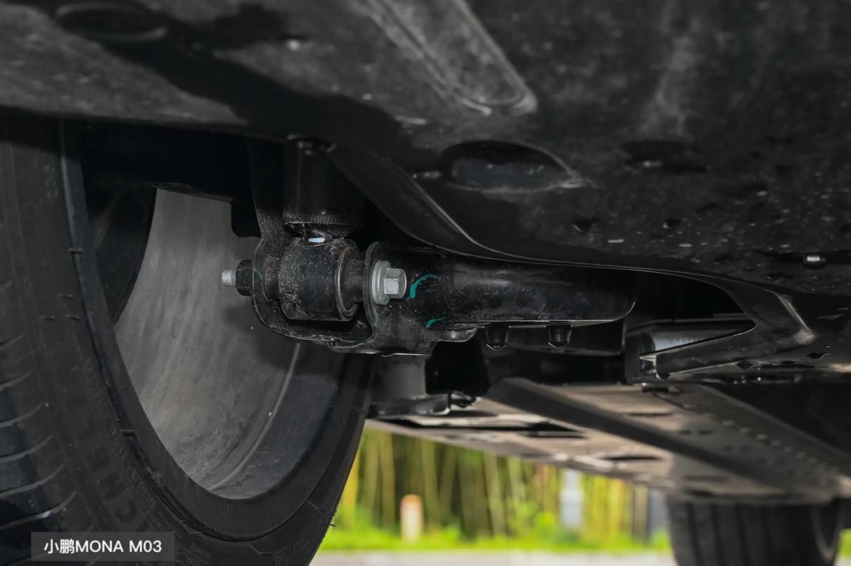 接下来是底盘,小鹏M03用的是前麦弗逊+后扭力梁组合,后桥的非独立悬架设计有利于节省空间,但遇到烂路或大弯道,它的滤振或横向支撑效果就有点儿差强人意了。