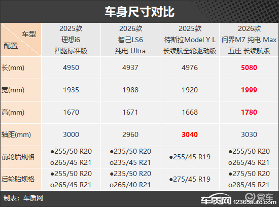 车身尺寸部分,问界M7的长宽高在三款车中占据明显优势,长5080mm、宽1999mm、高1780mm;而轴距方面,表现最突出的是特斯拉Model Y L,轴距达到3040mm。轮毂尺寸上,除特斯拉Model Y L为19英寸轮毂外,其余车型标配20英寸轮毂。此外,理想i6、智己LS6和问界M7还支持选装21英寸轮毂。