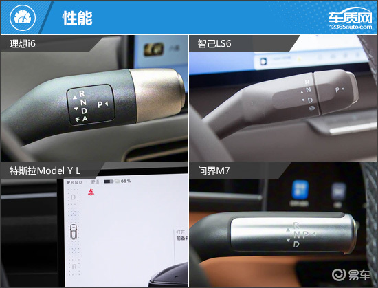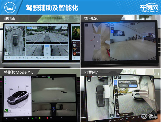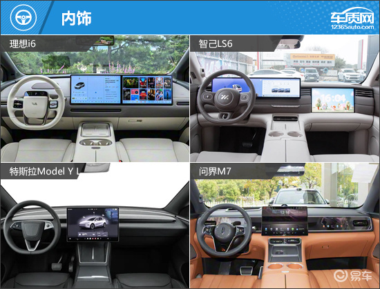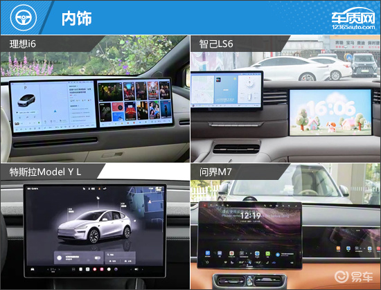 内饰部分,四款车均为简约时尚的设计风格,配备大尺寸中控屏,除特斯拉Model Y L,另外三款车均以大面积软质材料包裹。其中,理想i6的仪表屏设置在方向盘上,虽然查看信息直观,但显示内容不够丰富;智己LS6的仪表屏和中控屏为联屏设计,科技感浓郁;特斯拉Model Y L仅配备一块中控屏,同时也是四款车中唯一采用屏幕按键换挡形式的车型;问界M7有着很强的家族化设计理念,相比之下更具几分豪华气息。