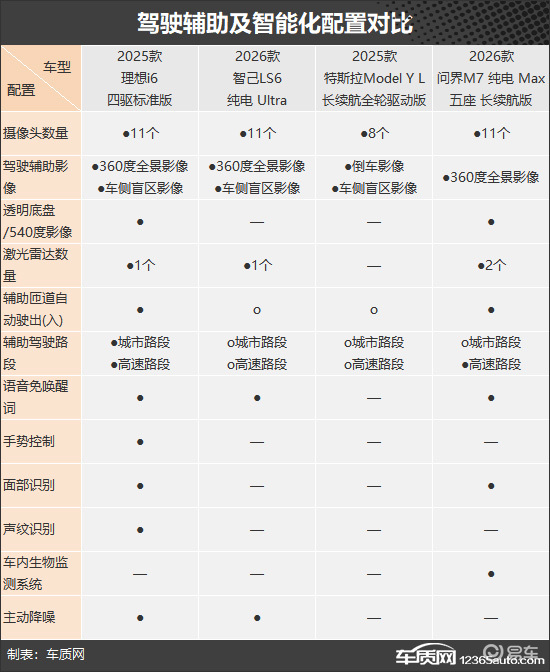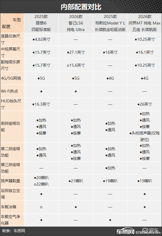 内部配置方面,由于智己LS6采用双联屏设计,其中控屏尺寸最大,达到27.1英寸;除特斯拉Model Y L,其余车型均提供副驾娱乐屏,但需要注意的是,智己LS6需要单独花钱选装。此外,理想i6和问界M7还有HUD抬头显示,方便驾驶者驾车时直观查看车辆信息。舒适配置上,四款车前排以及后排座椅均有加热、通风功能,问界M7还独享驾驶位头枕扬声器,并且和理想i6一样提供了后排独立空调;值得一提的是,特斯拉Model Y L是唯一采用6座座椅布局的车型,并且第三排也贴心地设置了座椅加热功能,更适合多人用车场景需求。