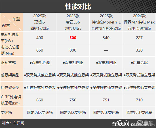 性能方面,只有问界M7为后置后驱,搭载单电机,其余车型均采用双电机四驱的驱动方式,且四款车型均匹配固定齿比变速箱。电动机参数性能上,智己LS6以500kW的电动机总功率拔得头筹。四款车型均配备了前双叉臂式独立悬架,后悬架方面,理想i6和问界M7为五连杆式独立悬架;而智己LS6和特斯拉Model Y L为多连杆式独立悬架。CLTC纯电续航里程最长的是特斯拉Model Y L,达到751km,和第二名的智己LS6仅有1km的细微差距;而理想i6的660km虽然最短,但也足够日常使用。