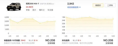 坦克300 Hi4-T属于坦克300的插电混动版车型,动力系统由2.0T发动机和前置单电机组成,传动系统匹配9挡手自一体变速箱。参考销量来看,坦克300 Hi4-T 10月销量为2942辆,预计与之定位接近的潜在竞品包括北京越野BJ40增程(指导价17.98万-20.48万元)、212 T01 PHEV(未上市)等。有关坦克品牌的更多信息,我们将保持关注。