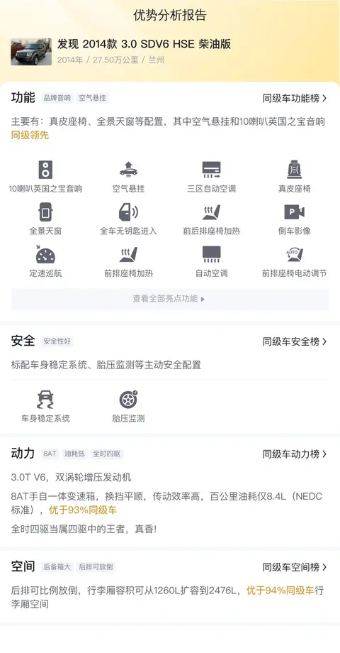 发现 2014款 3.0 SDV6 HSE 柴油版在动力性能、空间舒适性、豪华配置等方面具备明显优势,如3.0T柴油发动机提供的强劲动力,以及英国之宝音响、全景天窗等豪华配置。然而,作为早期的豪华SUV车型,它在智能互联和驾驶辅助科技方面可能不如 newer models 先进。此外,较高的用车成本和维护费用可能不适合预算有限的消费者。