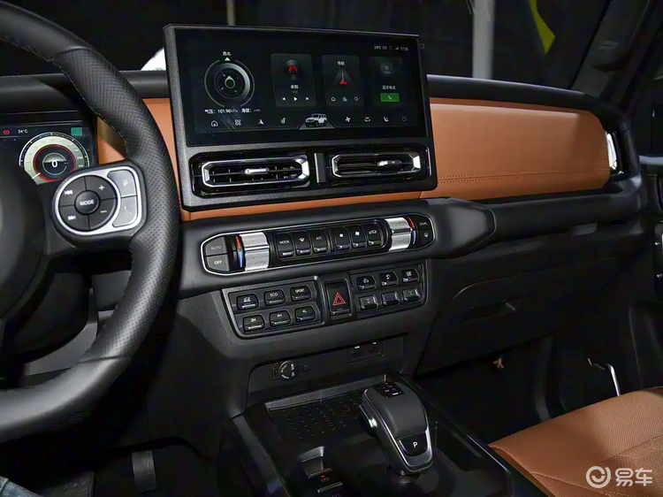 别看是硬派SUV,内饰配置也没落下。10.25英寸仪表+12.3英寸中控屏组成双联屏,支持导航、手机互联,标配前后雷达和360度全景影像,停车、窄路会车更从容。空调控制区、越野功能控制区均为物理按键,戴手套操作也不耽误,越野时盲操更方便。