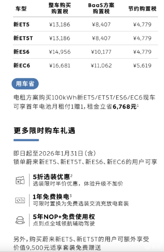蔚来汽车也是给到购置旗下新 ET5 、新 ET5T 、新 ES6 、新 EC6 等车型,省购置税 + 5 折选装优惠等多重限时购车礼遇。