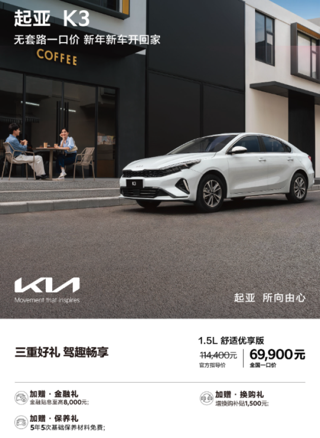 起亚 K3 1.5L 舒适优享版,一口价 6.99 万元。